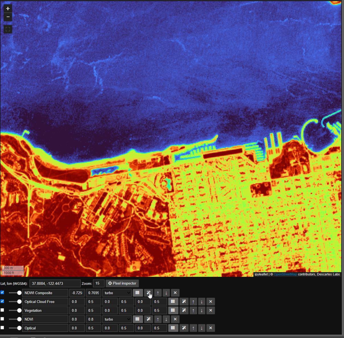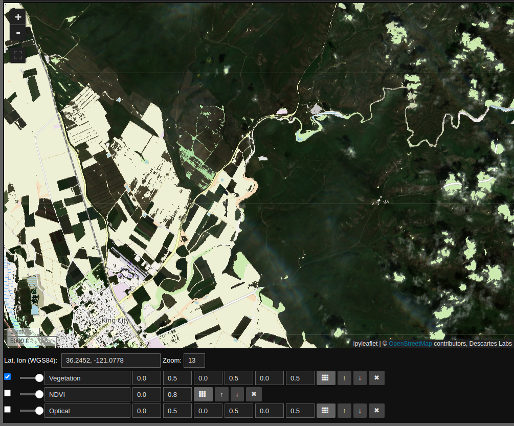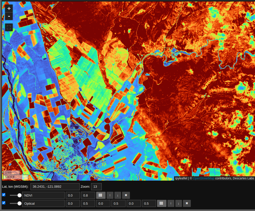 Our first example is to render some optical data on the map. We will start by looking at agriculture in California’s Central Valley. One can pan the map to the area of interest, or programmatically set the map’s location and zoom level with: