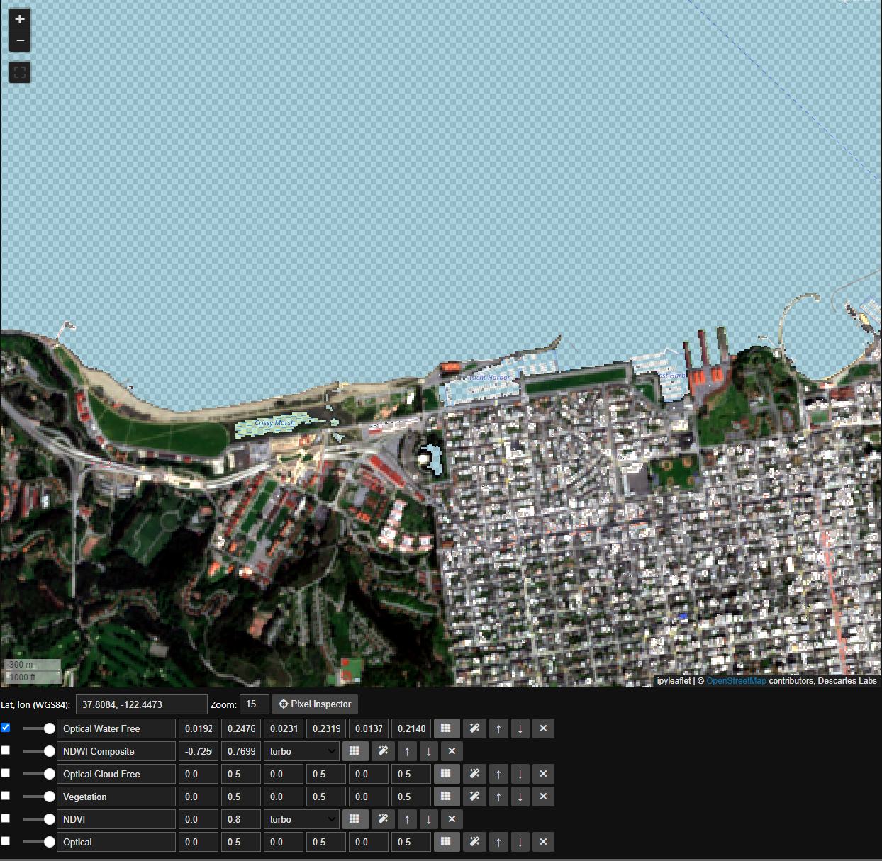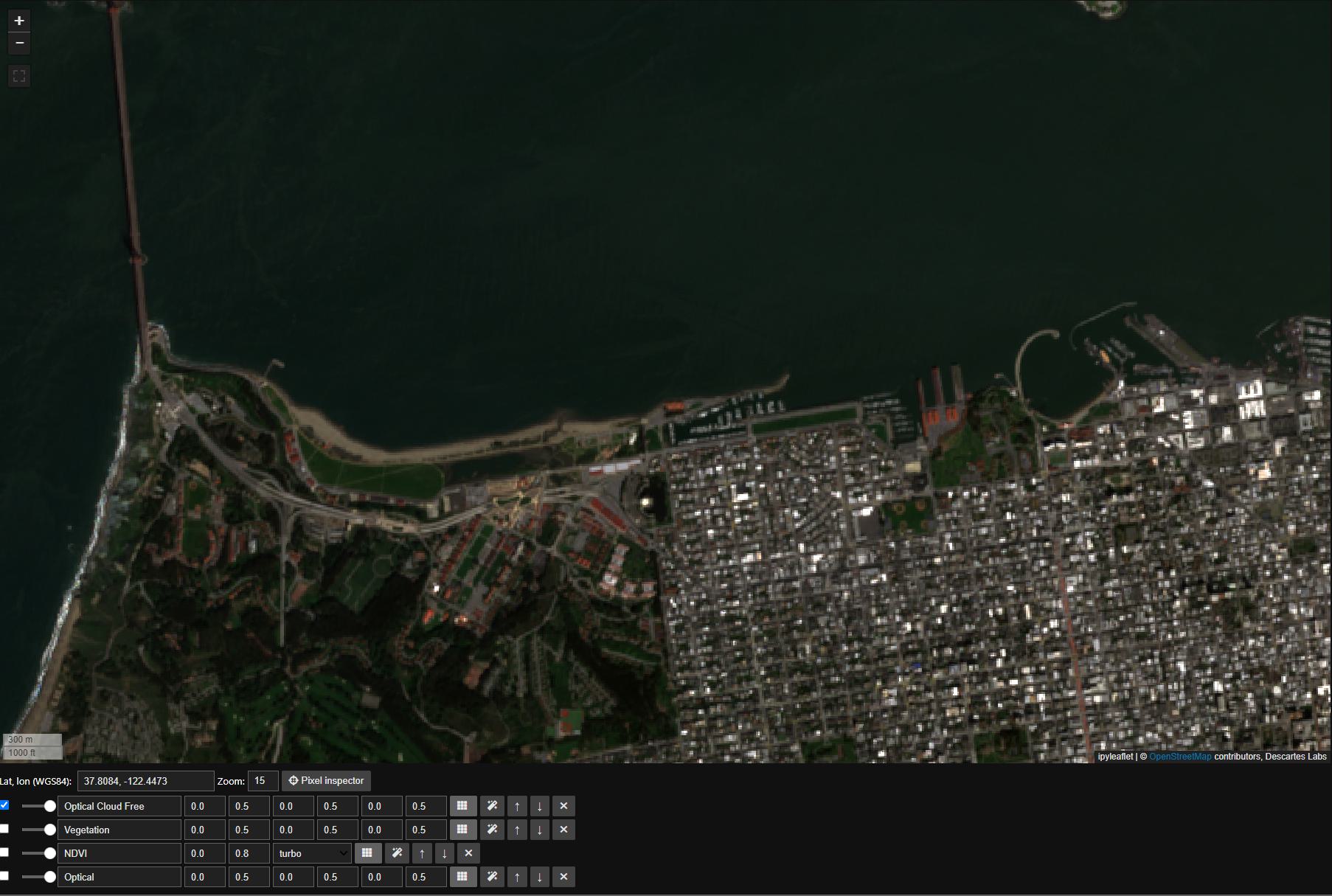 To recap: this layer computes NDVI, uses this quantity to create a mask, and finally renders the RGB layers for the non-masked regions. All of this is done on the fly, and can be applied to any map view.