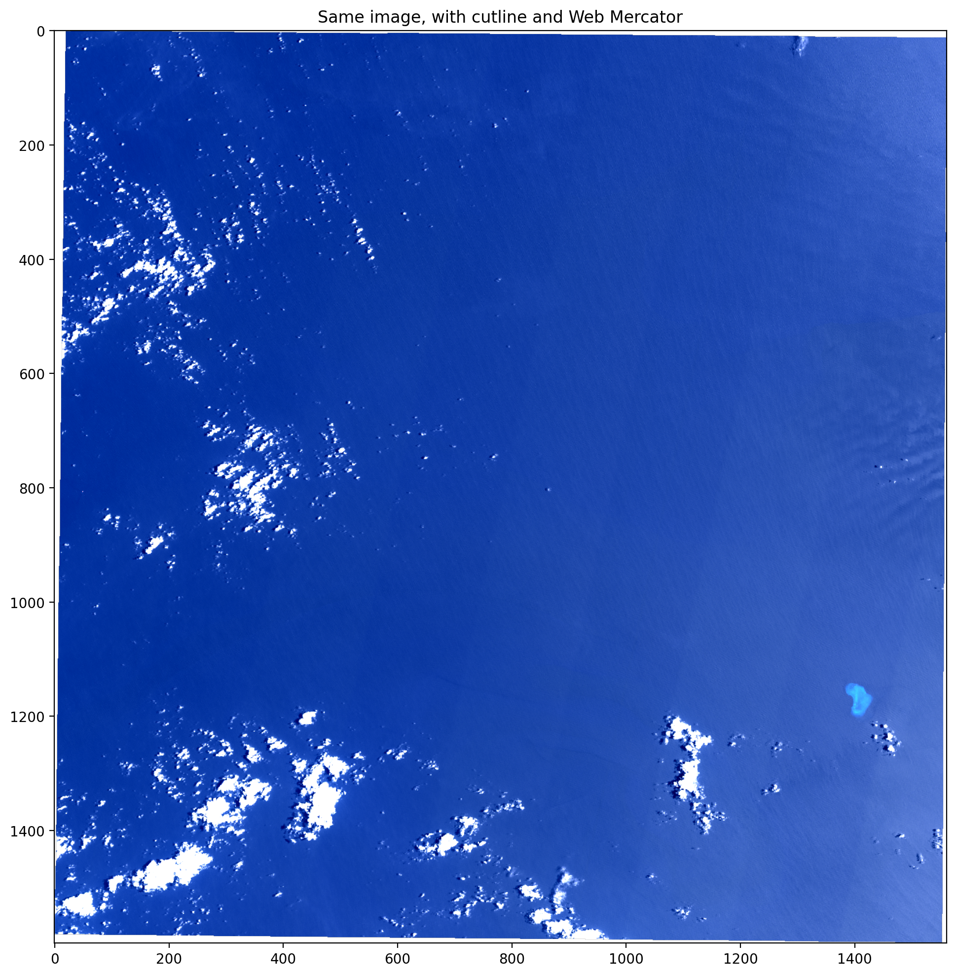 >>> display(webmerc_cutline_arr, title="Same image, with cutline and Web Mercator")