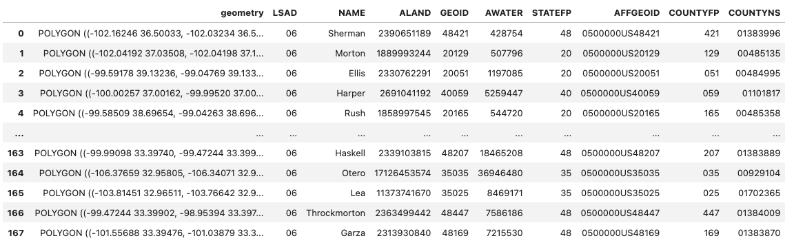 In the example above, invoking the collect() method returns a GeoPandas.GeoDataFrame containing rows (counties) that intersected our AOI. Since we did not set the columns option, all columns will be returned.