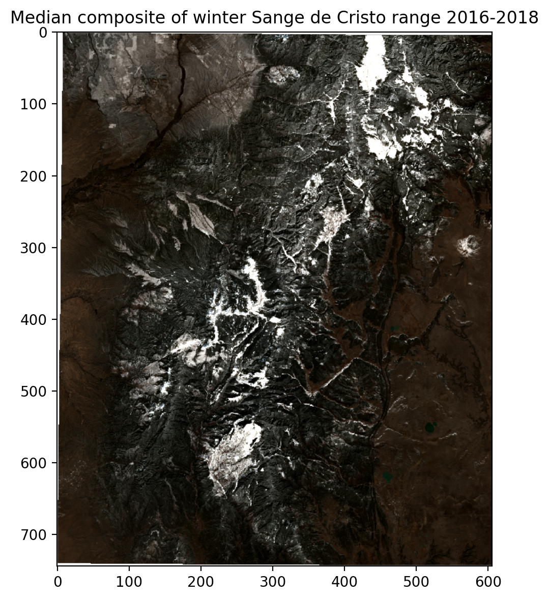 >>> eo.utils.display(winter_composite, title="Median composite of winter Sange de Cristo range 2016-2018", size=6)